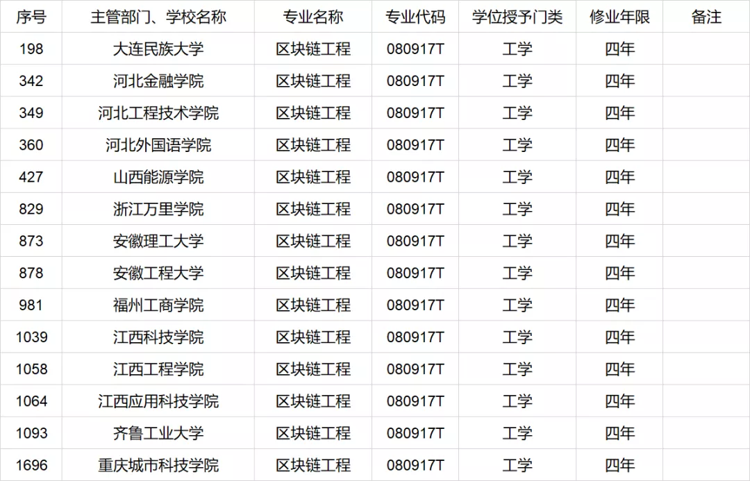隨著區(qū)塊鏈在行業(yè)發(fā)展初期迎來(lái)短期爆發(fā)式的增長(zhǎng),必將面臨行業(yè)相關(guān)人才儲(chǔ)備不足,從業(yè)單位用人難的問(wèn)題。為此,2021年2月10日,中華人民共和國(guó)教育部《關(guān)于公布2020年度普通高等學(xué)校本科專(zhuān)業(yè)備案和審批結(jié)果的通知》(簡(jiǎn)稱(chēng)《通知》)中公布,我國(guó)共有14家高等院校,申請(qǐng)開(kāi)設(shè)了“區(qū)塊鏈工程”本科專(zhuān)業(yè)課程,持續(xù)為行業(yè)輸送后續(xù)力量,區(qū)塊鏈人才短缺問(wèn)題,將在幾年后得到有效緩解,并持續(xù)為行業(yè)輸送后續(xù)力量。本次公布的14家高校分別為大連民族大學(xué)、河北金融學(xué)院、河北工程技術(shù)學(xué)院、河北外國(guó)語(yǔ)學(xué)院、山西能源學(xué)院、浙江萬(wàn)里學(xué)院、安徽理工大學(xué)、安徽工程大學(xué)、福州工商學(xué)院、江西科技學(xué)院、江西工程學(xué)院、江西應(yīng)用科技學(xué)院、齊魯工業(yè)大學(xué)、重慶城市科技學(xué)院。